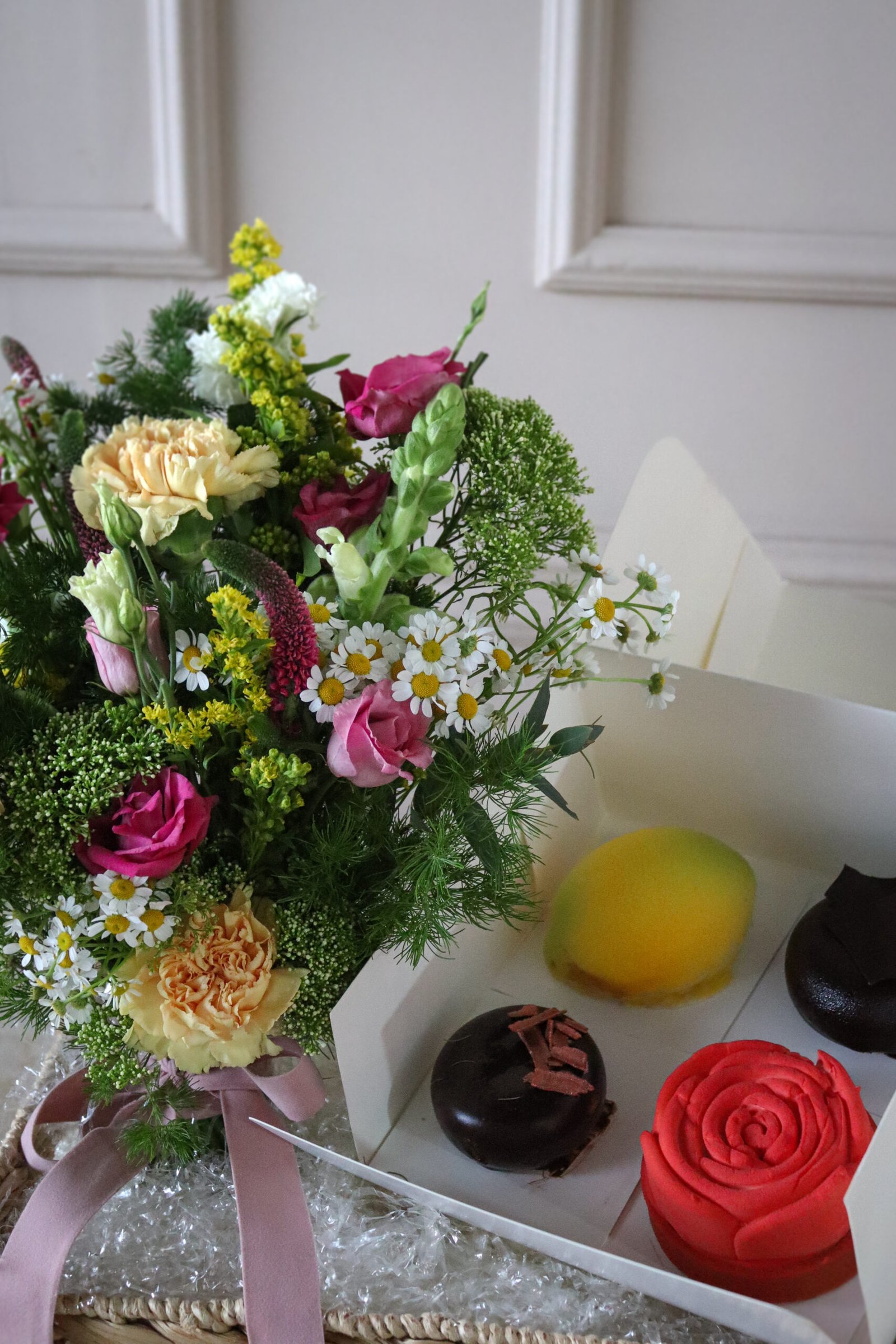 Composición de flores naturales de temporada acompañada de pasteles variados de la empresa Botanicc Cáceres, una pastelería que ofrece una experiencia gourmet artesanal, inspirada en la naturaleza, con repostería de diseño.