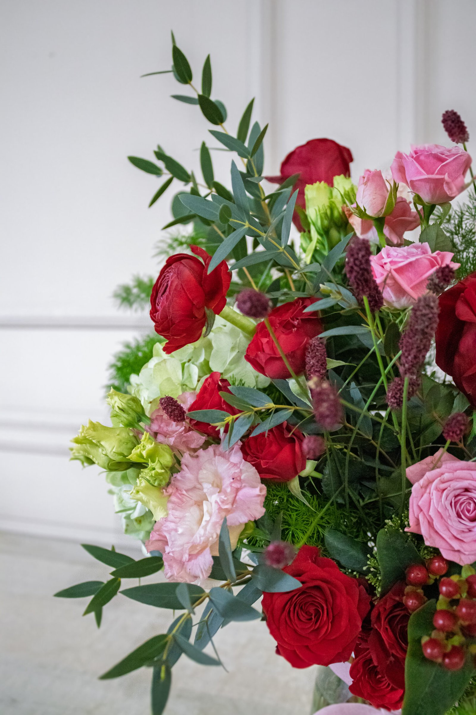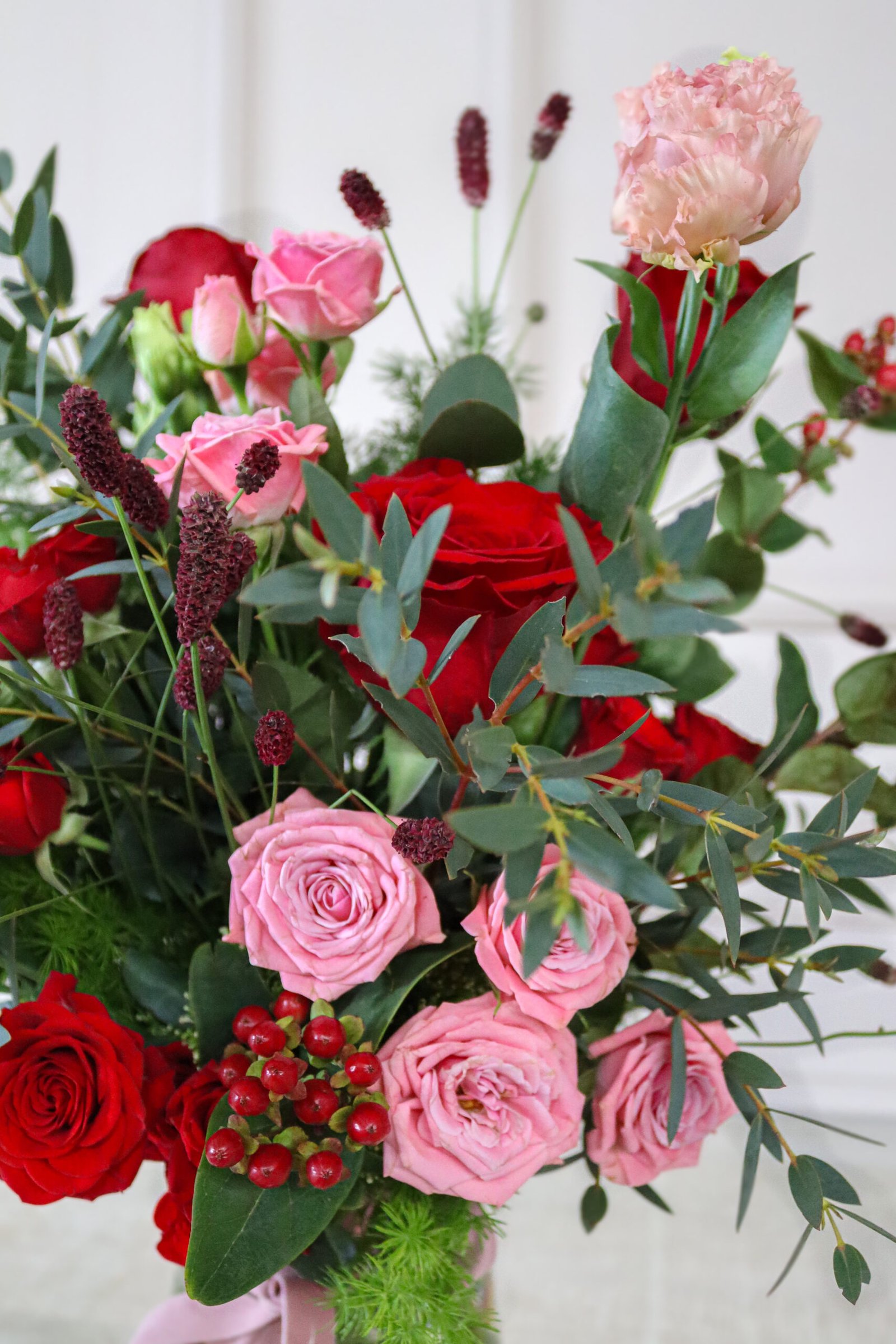 Jarrón de cristal con flores variadas en tonos rojos y rosas acompañadas de rellenos silvestres cuidadosamente elegidos para la ocasión. La combinación de las flores y verdes puede variar por falta de disponibilidad y podrán ser diferentes a las de la fotografía.